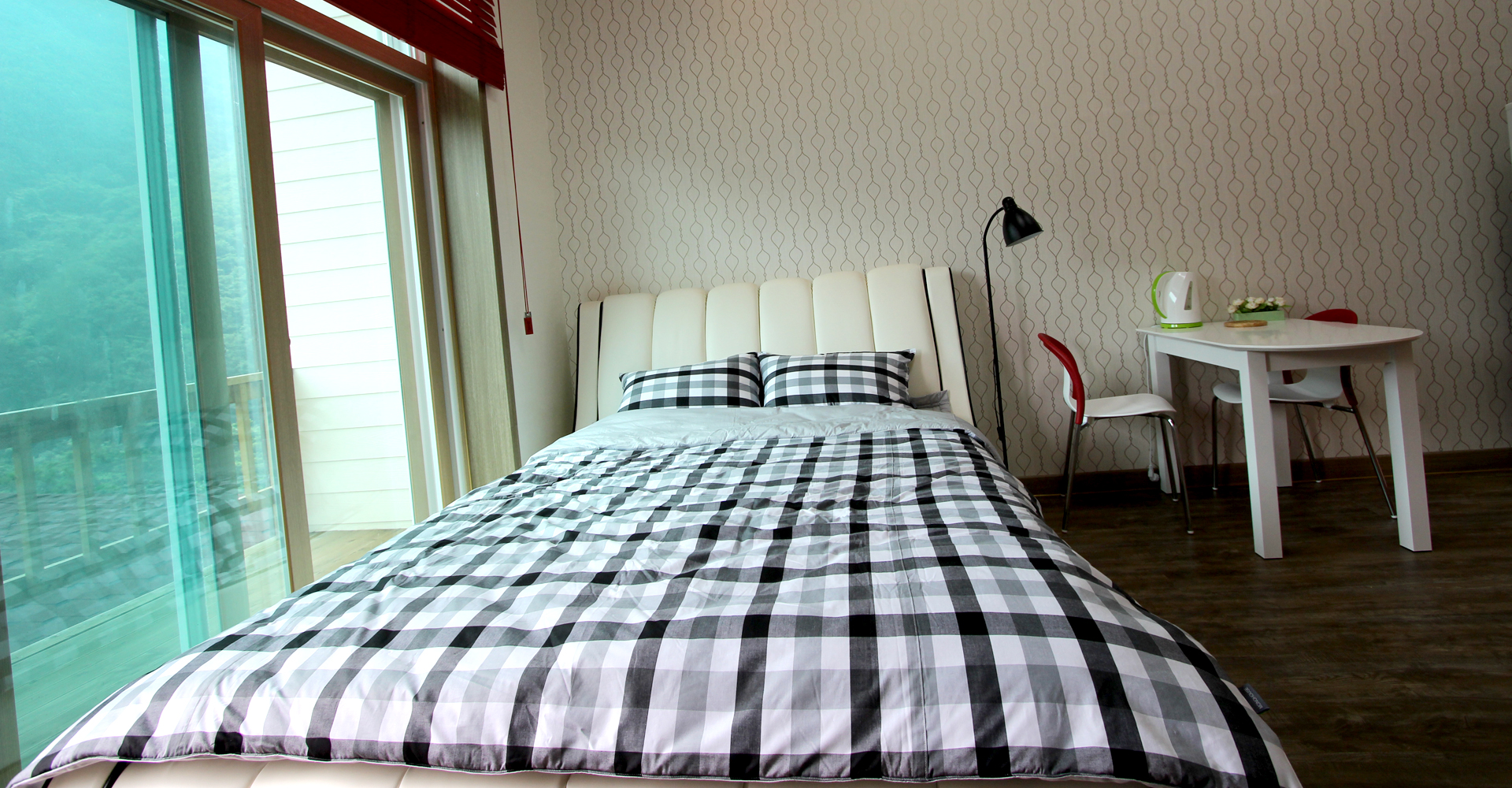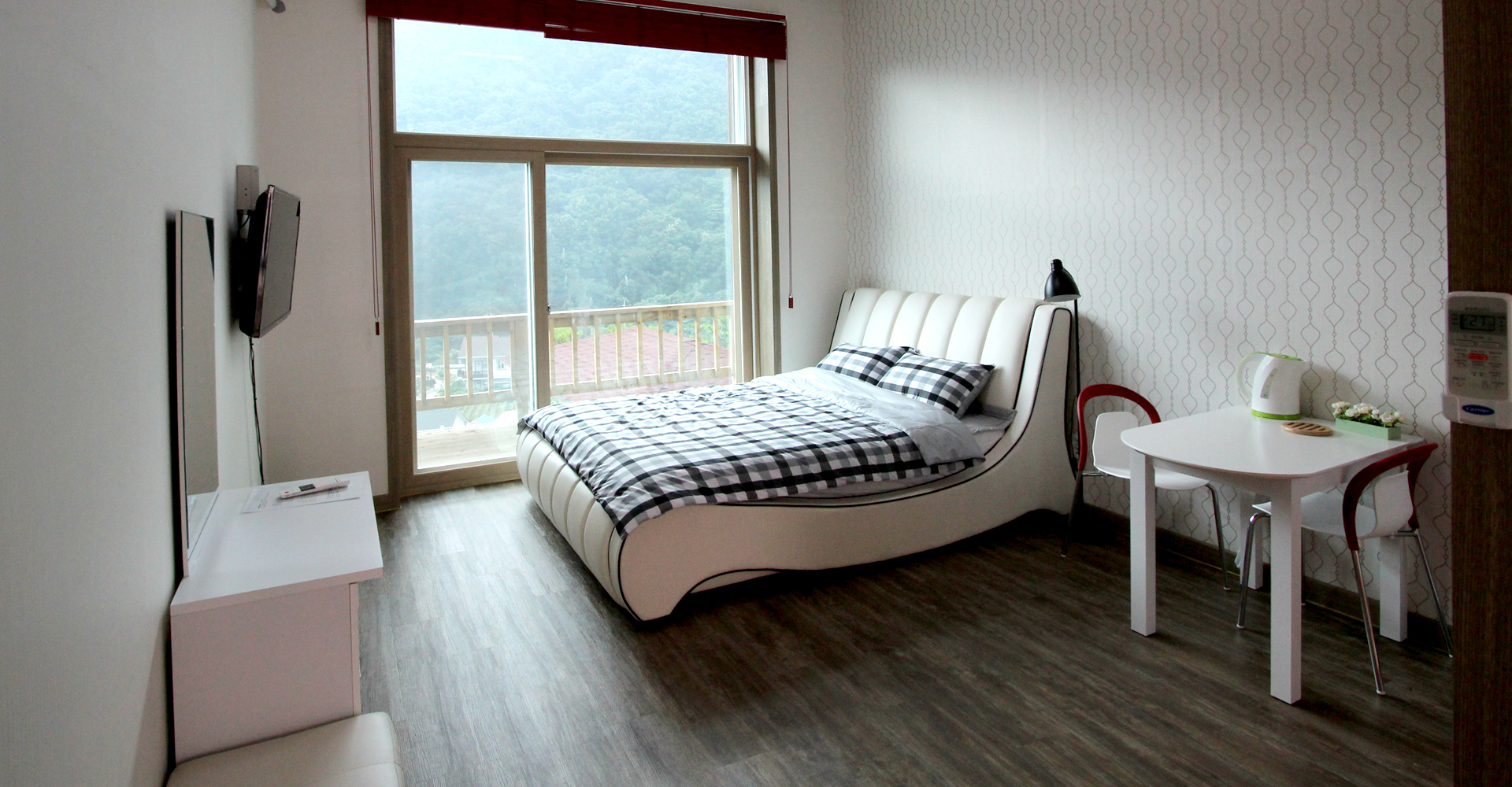 2층 룸은 천장이 높은데 밖을 볼수 있는 베란다 창도 같이 높아 탁트윈 시야로 인해 가슴까지 시원해 집니다. 2층 객실은 공동 실내바베큐장을 이용하시면 됩니다.